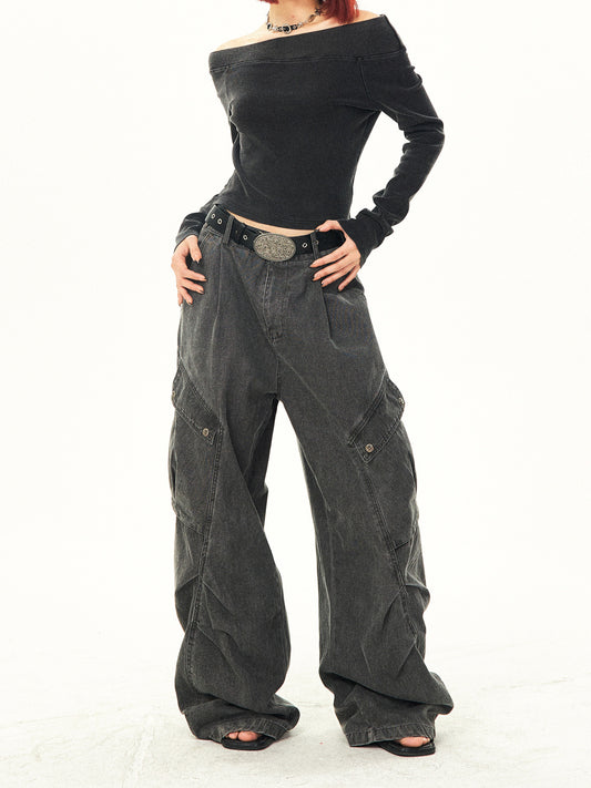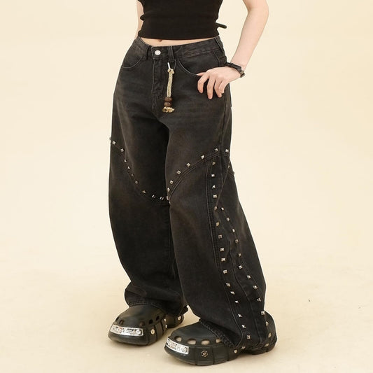 Rivet Design Washed Jeans Retro Wide-leg Pants