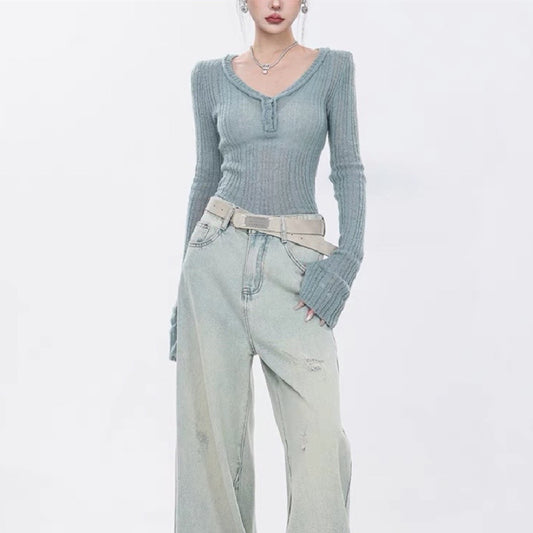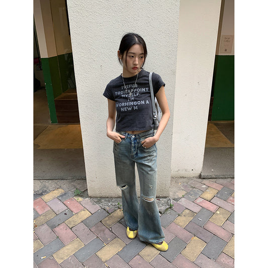 Retro Make Old Ripped Straight Casual Pants Women's High Street Slimming Jeans