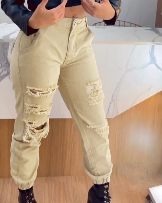 Black Tight Stretch Skinny Trousers Women's Ripped Denim Trousers