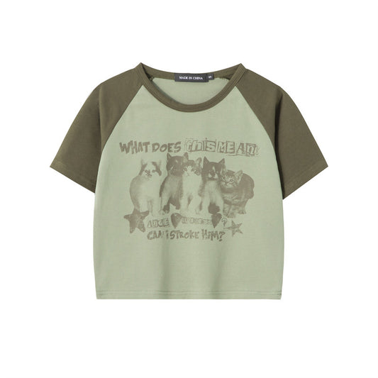 Color-block Raglan Sleeves American Retro Crew Neck Cropped Cropped T-shirt