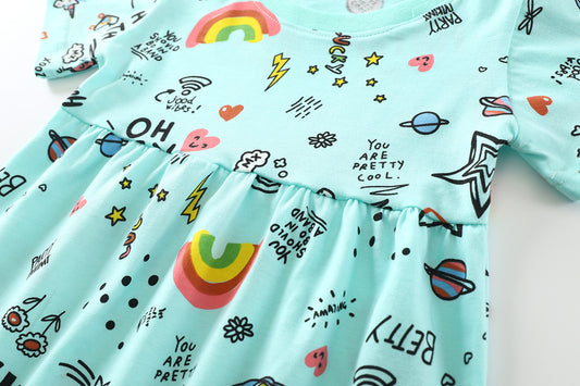 Flying Sleeve Cartoon Print Children's Western Style Dress