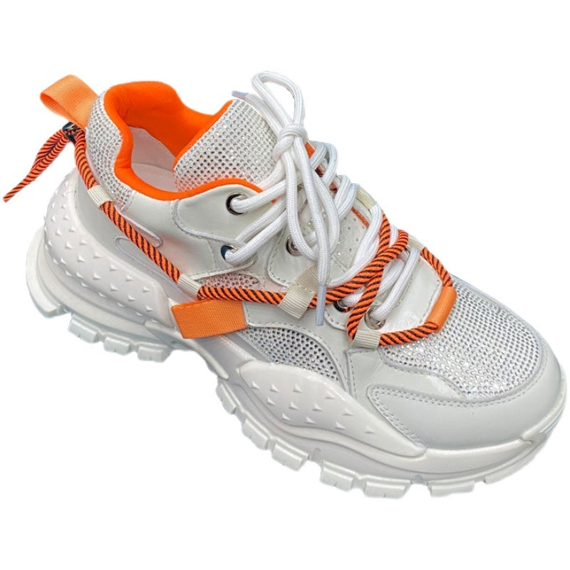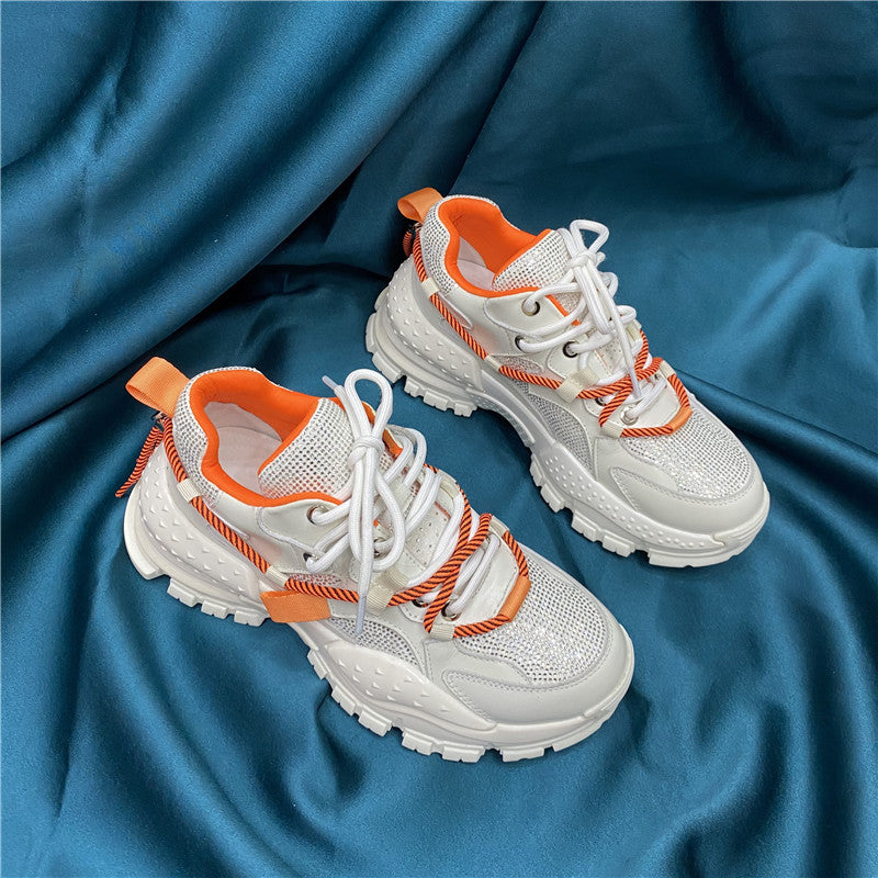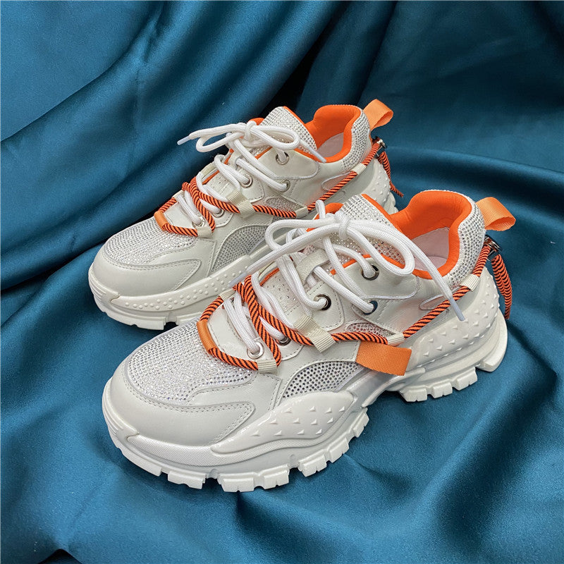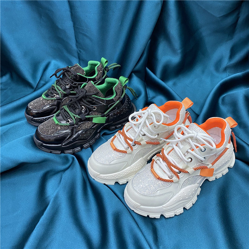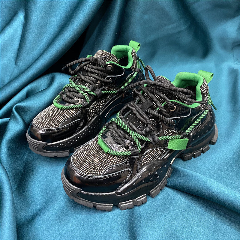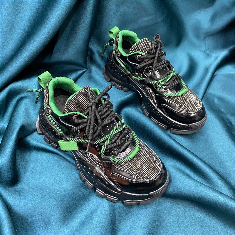 Daddy Shoes Leather Rhinestone Lace-up Platform Platform Casual Sneakers Women