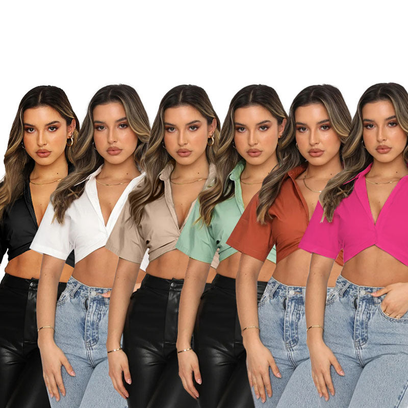 Summer Short-sleeved Polyester Cotton Solid Color Cute Single-breasted Lapel Shirt For Women